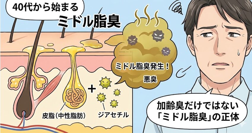 ただし、実際には30代後半〜40代前半の男性に目立つ「ミドル脂臭」というタイプのニオイもあり、年齢や生活習慣によって複数の体臭が重なっていると考えられています。