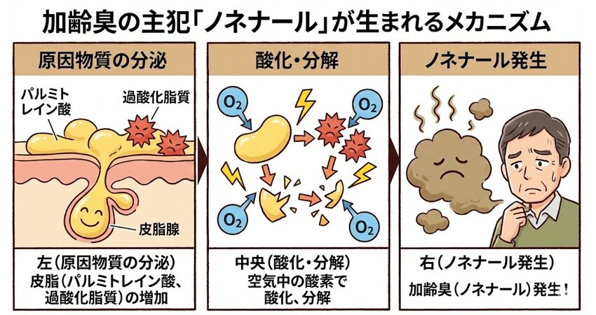- その過程で、独特のニオイを持つ「ノネナール」が生じると考えられている