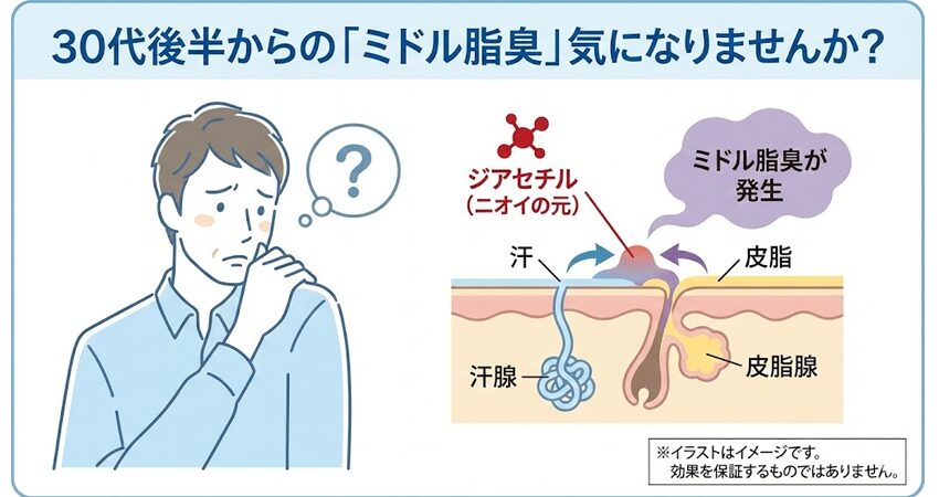 30代後半〜50代になると、多くの男性が「ニオイ」=加齢臭・ミドル脂臭を意識し始めます。