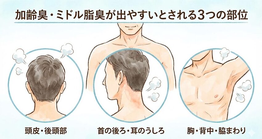 特に、加齢臭・ミドル脂臭が出やすいとされるのは、次の3つの部位です。