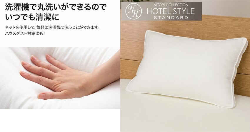 また、ニトリの洗えるホテルスタイル枕のように、コスパが良く、汚れたら買い替えやすい枕を「消耗品」と割り切って使うのもひとつの選択肢です。