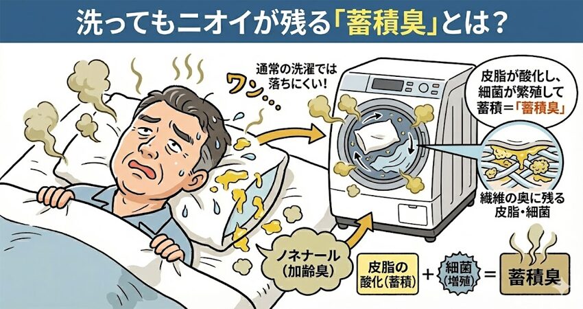 「洗った直後は柔軟剤のいい香りがするのに、乾いたらまたオヤジ臭に戻る…」これは蓄積臭(ニオイ戻り)と呼ばれる状態です。