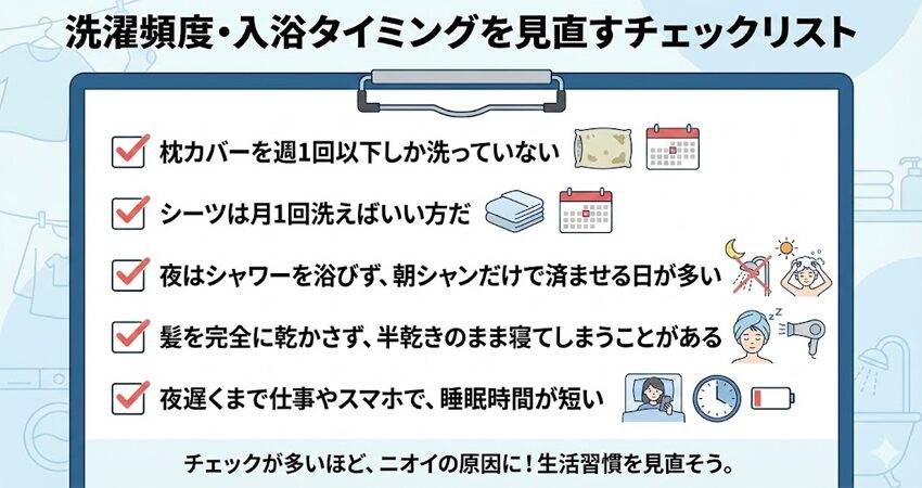 3つ以上当てはまる場合は、枕と寝具のニオイリセットに加えて、生活習慣そのものの見直しも同時に進めていくのがおすすめです。