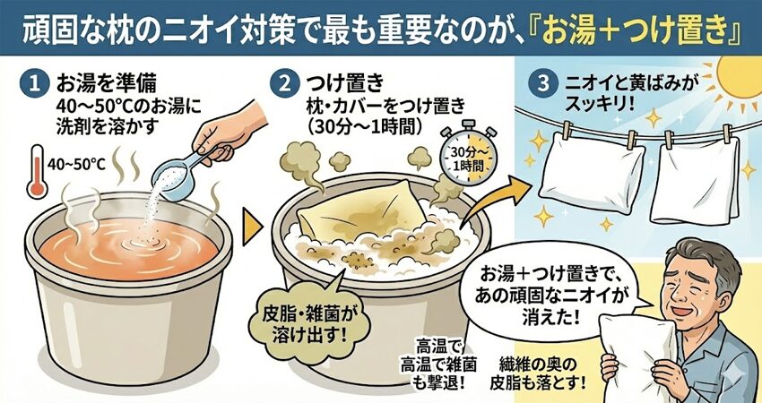 頑固な枕のニオイ対策で最も重要なのが、「お湯+つけ置き」です。