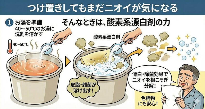 通常の洗濯だけでは落ちない蓄積臭には、つけ置き+酸素系漂白剤などの「一段階深いケア」が必要です。