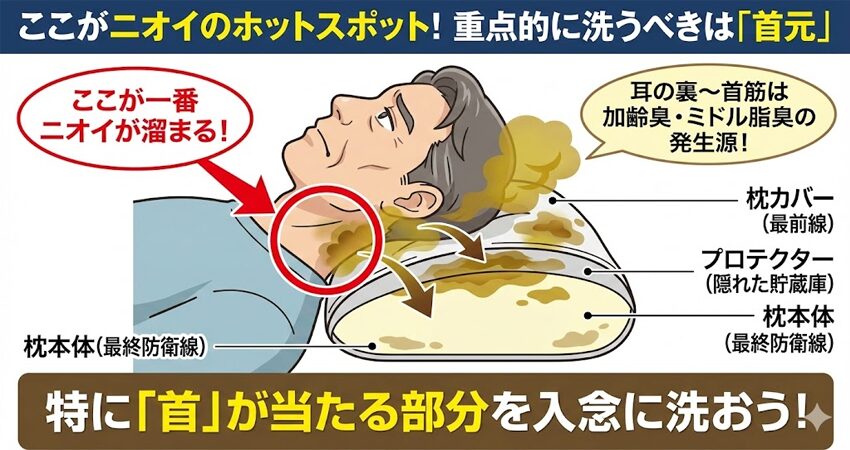 耳の裏~首筋:加齢臭(ノネナール)やミドル脂臭(ジアセチル)が最も発生しやすい「ホットスポット」です。枕の真ん中よりも、手前の盛り上がっている部分に強烈なニオイ成分が付着します。