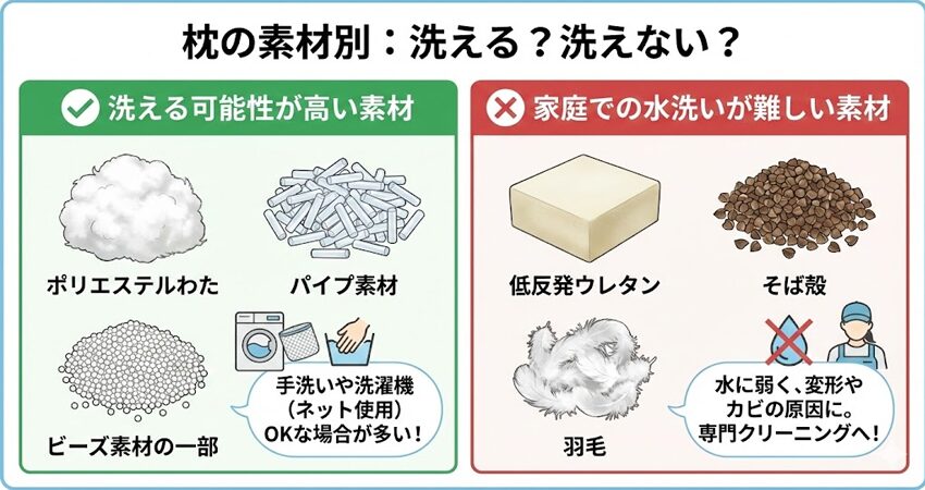 枕本体のケアでまず確認したいのが、「洗える枕かどうか」です。