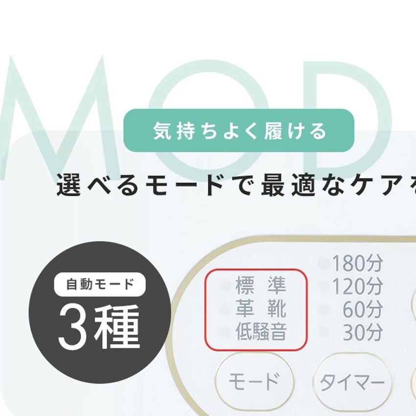 モデル案内では、標準・革靴・低騒音などのモードが用意され、革靴は低温寄りの風で乾燥する想定が示されています。