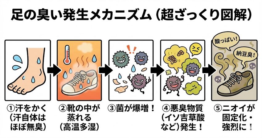 靴を脱いだ瞬間に、酸っぱい・納豆っぽい・古漬けみたいなニオイがふわっと上がる。