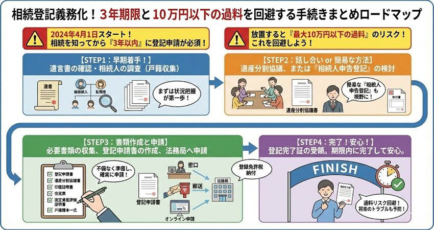 原則として、相続で不動産を取得したことを知った日から3年以内に申請が必要で、正当な理由なく放置すると10万円以下の過料の対象になり得ます。