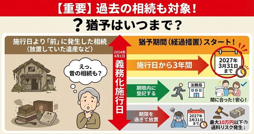 - 過去の相続も未登記なら対象になり得て、実務上は2027年3月31日が強い目安になります。