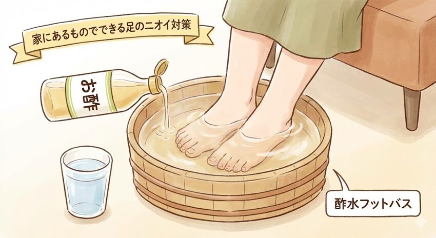 お酢は酸性の液体です。足の裏の環境は汗によって中性〜弱アルカリ性に傾くことがあり、そこに酸性の環境を与えることで、菌が繁殖しにくい条件をつくりやすいと考えられています。また、お酢特有の匂いが、足のイヤなニオイを一時的にマスクしてくれることもあります。