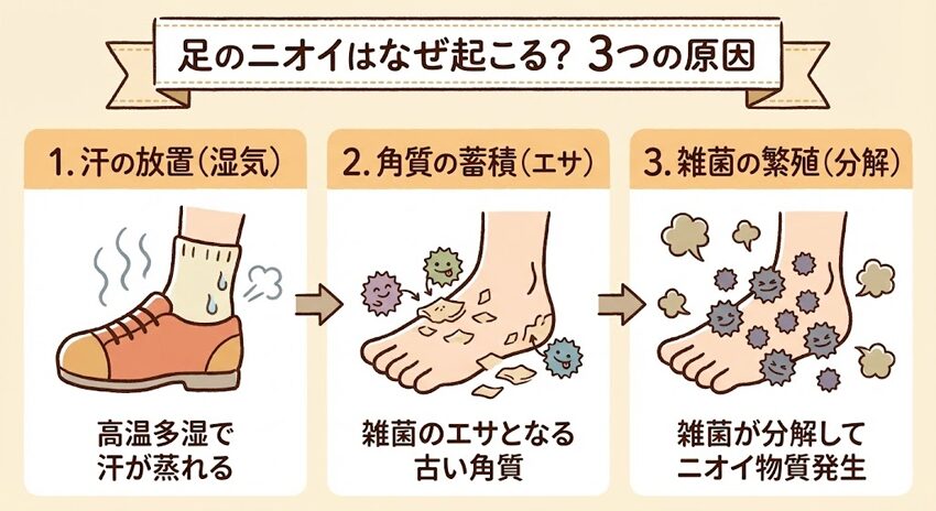 足のニオイは、誰もが一度は悩む身近なトラブルです。原因は、足裏の汗と、それをエサにする菌、そしてムレた靴・靴下・生活環境が合わさって起こる体の自然な仕組みです。