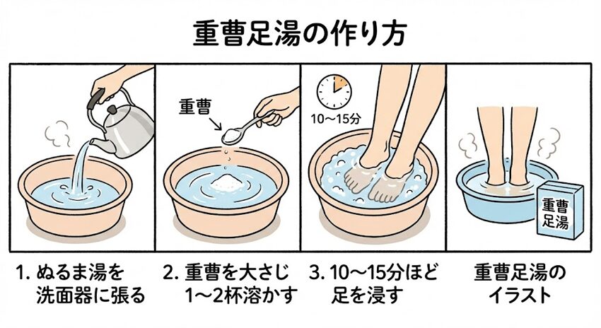 重曹は弱アルカリ性。足の裏の皮脂や角質は酸性寄りの性質を持つため、アルカリ性の水に浸けることで、汚れが落ちやすい状態になります。足湯のあとに石けんで洗い流すと、「足裏がすべすべした」「スッキリした」と感じる方が多い方法です。