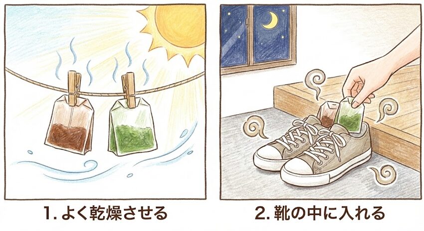 茶葉にはポリフェノールやタンニンと呼ばれる成分が含まれており、これらがニオイ物質を吸着すると考えられています。お茶の自然な香りが靴の中に移ることで、ナチュラルな芳香剤としての役割も期待できます。