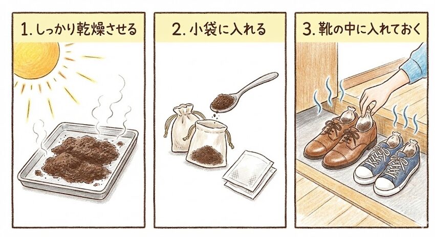 コーヒーかすは多孔質構造(小さな穴がたくさんある)をしており、空気中のニオイ分子を吸着しやすいと言われています。冷蔵庫や車の消臭にも使われることが多く、靴のニオイ対策としても再利用しやすいアイテムです。