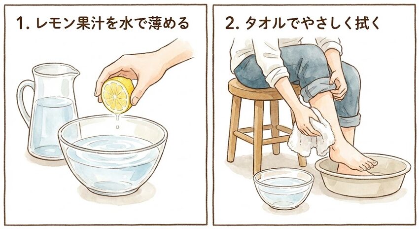 レモンは酸性の液体で、柑橘特有のさわやかな香りがニオイを一時的にマスクしてくれます。拭いた直後の清涼感から、「すっきりした」「サンダルを履く前のケアにちょうどいい」と感じる方も多い方法です。