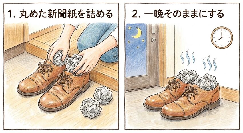• 靴を脱いだ後、丸めた新聞紙をぎゅっと詰める